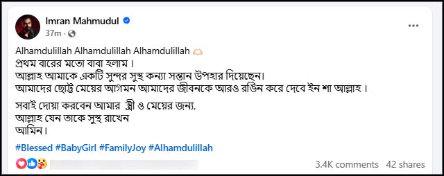 এছাড়া ইমরান নিজেও নিশ্চিত করেছেন বিষয়টি। এদিন সন্ধ্যা ৬টা ৫০ মিনিটে ফেসবুক ভেরিফায়েড পেজে এক স্ট্যাটাসে গায়ক লিখেছেন, ‘আলহামদুলিল্লাহ। প্রথমবারের মতো বাবা হলাম। আল্লাহ আমাকে একটি সুন্দর সুস্থ কন্যাসন্তান উপহার দিয়েছেন। আমাদের ছোট্ট মেয়ের আগমন আমাদের জীবনকে আরও রঙিন করে দেবে, ইনশাআল্লাহ। সবাই দোয়া করবেন আমার স্ত্রী ও মেয়ের জন্য। আল্লাহ যেন সুস্থ রাখেন।’