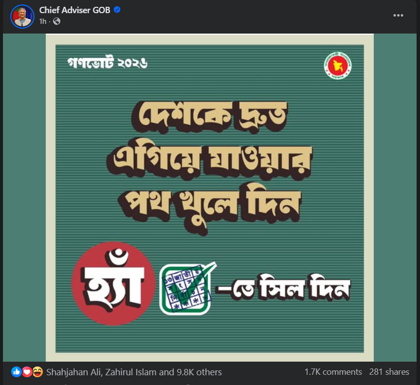 শনিবার (১৭ জানুয়ারি) বেলা ১১টার দিকে তিনি ফেসবুক ও এক্স পেজ থেকে ফটোকার্ডটি প্রকাশ করেন। ফটোকার্ডে লেখা, ‘গণভোট ২০২৬- দেশকে দ্রুত এগিয়ে যাওয়ার পথ খুলে দিন ‘হ্যাঁ’তে সিল দিন।’