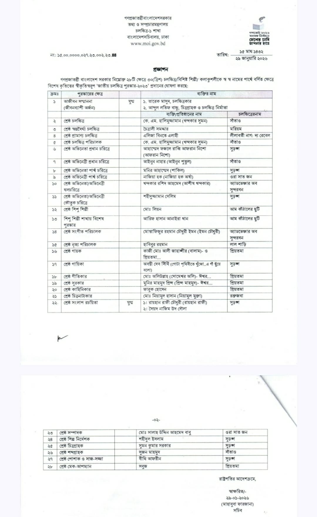 ২০২৩ সালের জন্য চলচ্চিত্রের সর্বোচ্চ রাষ্ট্রীয় সম্মান ‘জাতীয় চলচ্চিত্র পুরস্কার’ ঘোষণা করেছে সরকার। বৃহস্পতিবার (২৯ জানুয়ারি) তথ্য ও সম্প্রচার মন্ত্রণালয়ের এক প্রজ্ঞাপনে ২৮টি ক্ষেত্রে বিশেষ অবদানের জন্য মোট ৩০ জন শিল্পী ও কুশলীকে এই পুরস্কারের জন্য মনোনীত করে।